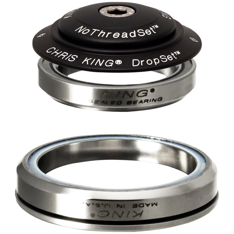 Chris King DropSet 5 Headset – 1-1/8″ 42/52mm 45 Deg Matte Black. The Dropset 5 integrated headset features the patented GripLock bearing cap which preloads the headset independently of clamping onto the steerer so it retains preload far better than the competition and is impervious to the ill effects of load spikes from large hits and heavy braking. This means smoother steering no more creaking and a longer lasting headset.