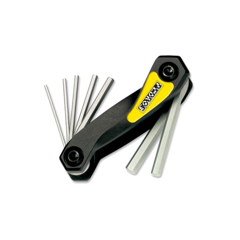 Pedro’s folding hex set multi-tools are essential for the shop, event, ride, and at home. These folding hex wrench sets feature tools made from heat-treated tool steel for strength, superior anti-corrosion finish for unmatched lasting performance, and handles made of lightweight but super tough composite material. The handles feature an ergonomic shape to perfectly fit in your hand and allow easy access to each tool. In addition, the handle has a built in tool stop that allows the wrenches to be rotated 270 degrees for leverage and ease of use. The Folding Hex Wrench Set weighs 105 grams and has 7 tools including 1.5, 2, 2.5, 3, 4, 5 and 6mm hex wrenches, all backed by Pedro’s lifetime warranty.